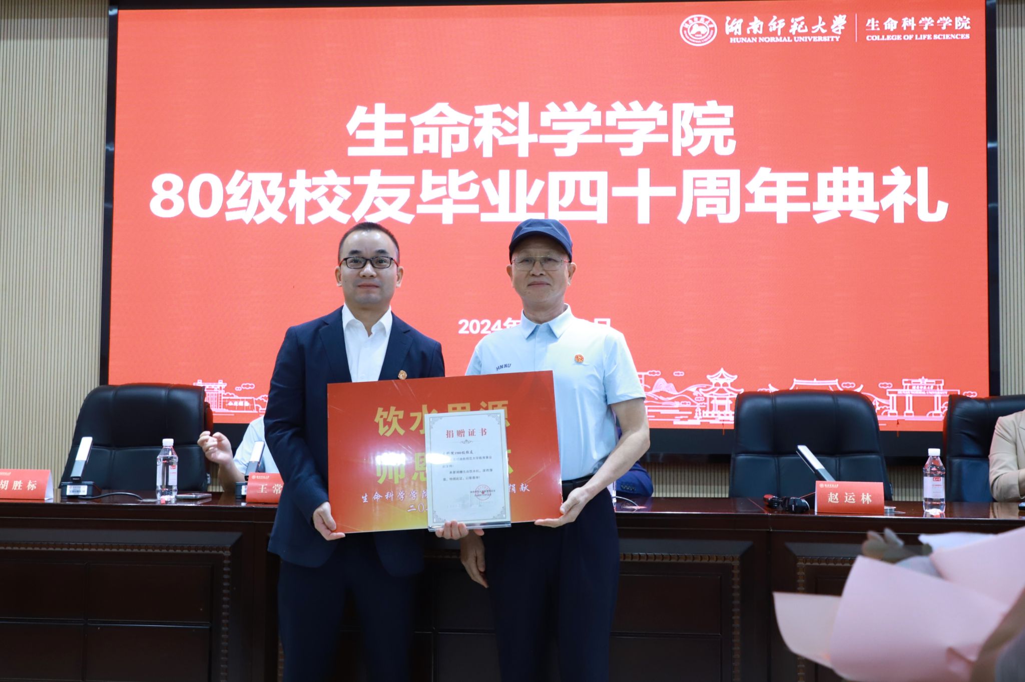 在校友捐赠环节,1980级同学会会长赵运林代表校友向学院捐赠了5台饮水机,表达校友对学校培养的感激之情,胡胜标代表学院接受捐赠并合影留念。饮水机价值约5万元,将安装在3号B栋各楼层和4号楼一楼。
